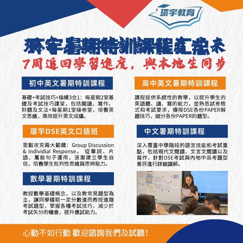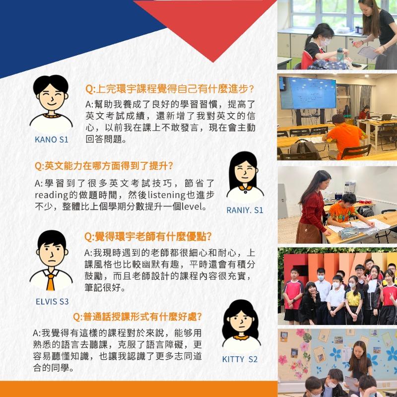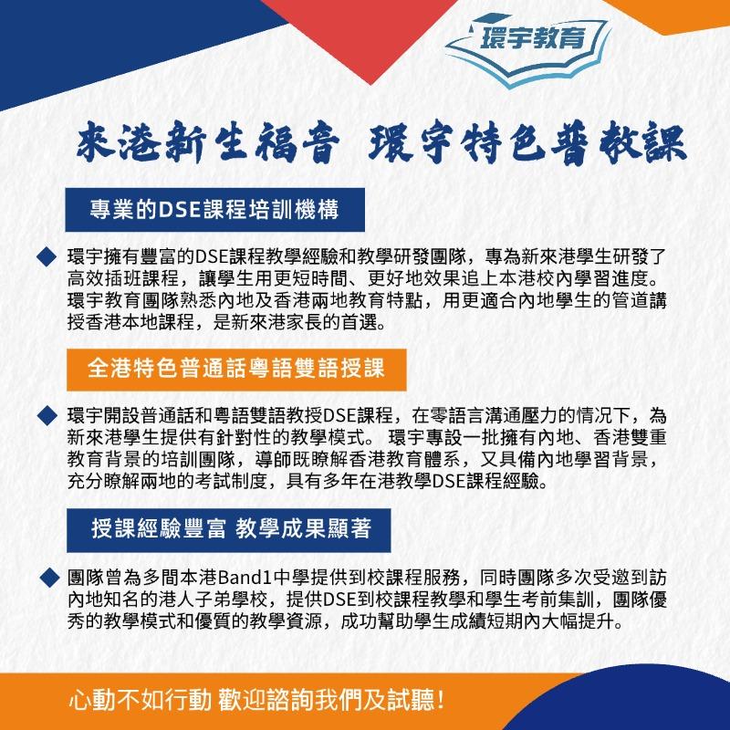 環宇導師均出自名校及英文專業,多位同時擁有內地、香港雙重教育背景,充分瞭解兩地的考試制度,並具多年在港教學DSE課程經驗,為學生量身定制DSE課程計畫,提供普通話培訓及輔導,讓你在最短的時間迅速適應香港DSE教育模式,輕鬆掌握DSE考試技巧~😌