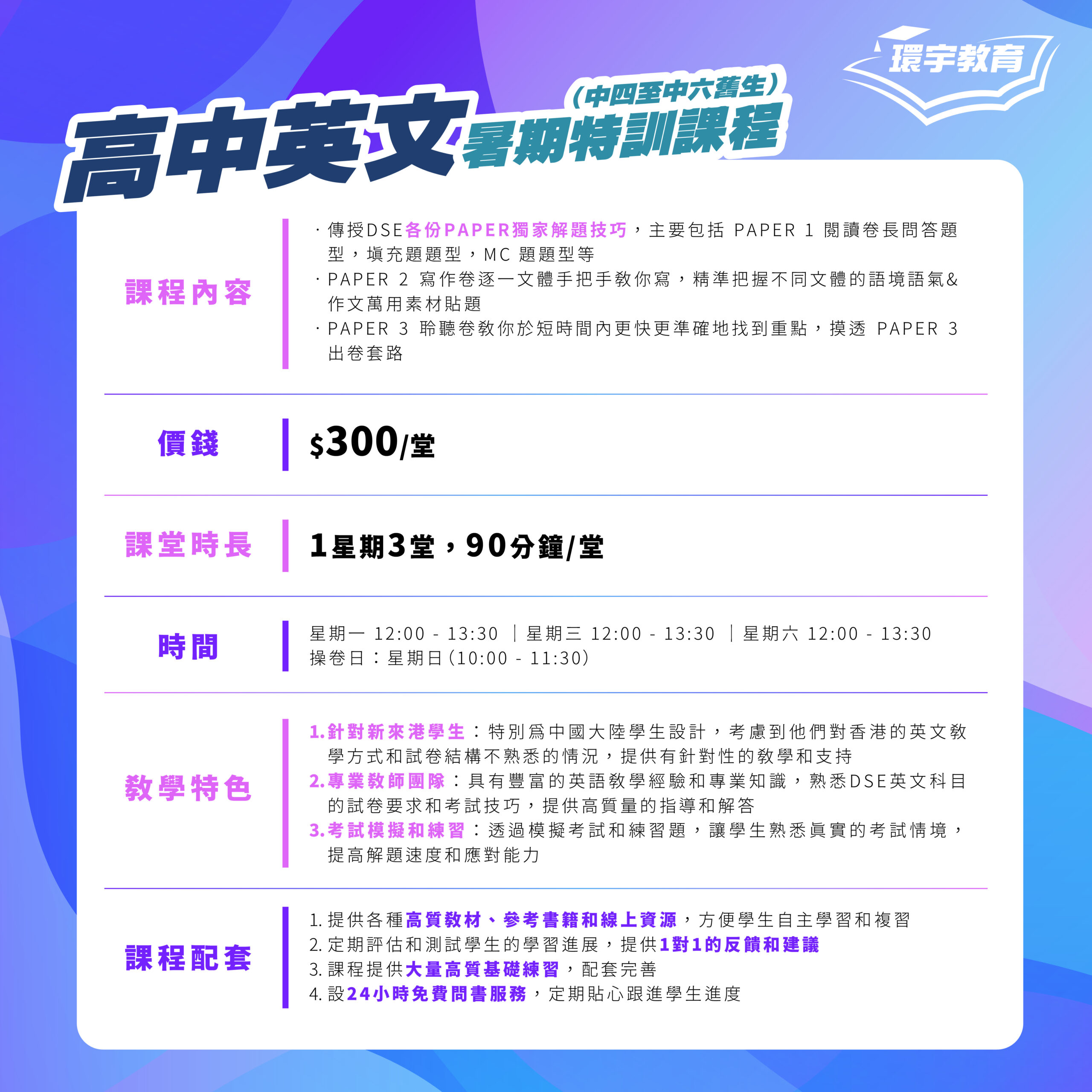 | 教學特色 | 1.針對新來港學生:特別為中國大陸學生設計,考慮到他們對香港的英文教學方式和試卷結構不熟悉的情況,提供有針對性的教學和支持。